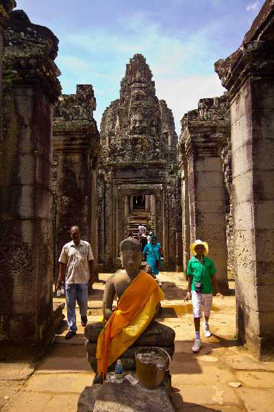 Bayon temple is the first temple after the south gate into Angkor Thom. Each heads face in the 4 compass directions. In many ways the unique architecture and design make Bayon my favourite, it is much more compact than Angkor Wat, which is spread out over a much greater area. Bayon is set on two major levels, the heads being on the upper level.