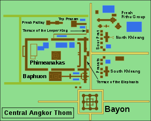 Angkor Thom was the last and most enduring capital city of the Khmer empire. It was established in the late twelfth century by King Jayavarman VII. It covers an area of 9 km², within which are located several monuments from earlier eras as well as those established by Jayavarman and his successors. At the centre of the city is Jayavarman's state temple, the Bayon, with the other major sites clustered around the Victory Square immediately to the north.