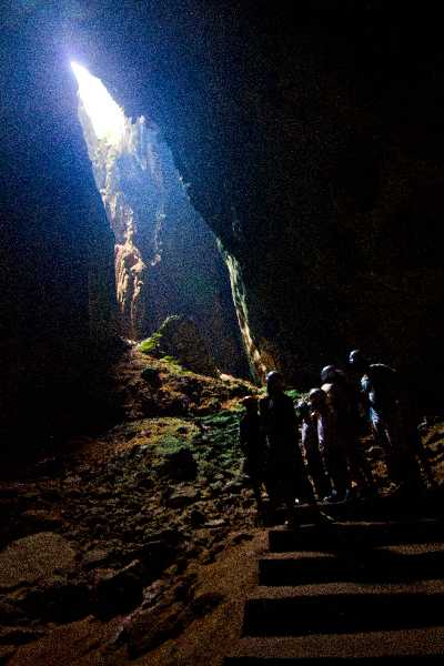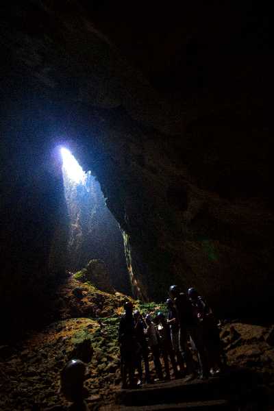 The dark cave is to the left of the cathedral cave, about 50 steps down from its entrance. It is unlit, home to several types of bats and other creatures like insects and spiders that depend upon the bat ecosystem, i.e. they eat the bat dung. It is a eco-preserve area..