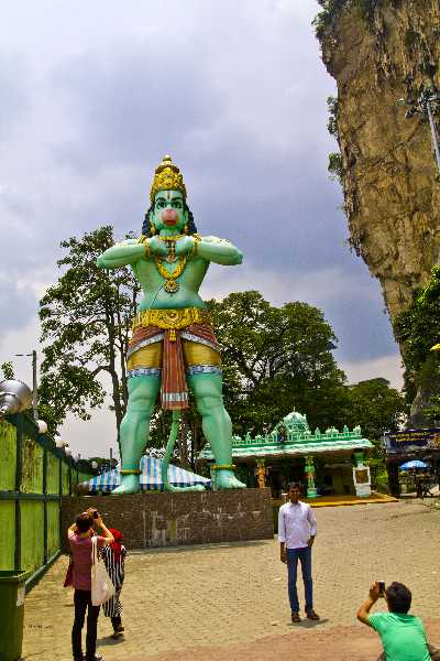 Rising almost 100 m above the ground, the Batu Caves temple complex consists of three main caves and a few smaller ones. The biggest, referred to as Cathedral Cave or Temple Cave, has a very high ceiling and features ornate Hindu shrines. To reach it, visitors must climb a steep flight of 272 steps, which is not a serious problem if you are half fit. In any case you may wish to stop along the way to take photos and to chase the macaque monkeys away from your stuff. At the base of the hill are two more cave temples, Art Gallery Cave and Museum Cave, both of which are full of Hindu statues and paintings. This complex was renovated and opened as the Cave Villa in 2008. Many of the shrines relate the story of Lord Murugan's victory over the demon Soorapadam. An audio tour is available to visitors. The Ramayana Cave is situated to the extreme left as one faces the sheer wall of the hill. On the way to the Ramayana Cave, there is a 15 m (50 ft) tall statue of Hanuman and a temple dedicated to Lord Hanuman, devotee and aide of Lord Rama. The consecration ceremony of the temple was held in November 2001. The Ramayana Cave depicts the story of Rama in a chronicle manner along the irregular walls of the cave. A 42.7-metre (140 ft) high statue of Lord Murugan was unveiled in January 2006, having taken 3 years to construct. It is the tallest Lord Murugan statue in the world. As is quite usual for Hindu statues and art, they are very colorful and not at all subtle in their features.