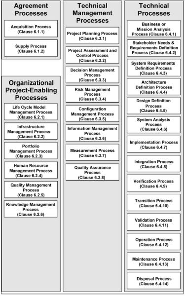 ISO 15288 was revised in 2013. There is a new process landscape with additional processes as shown in the diagram below. To aid the concurrent use of ISO/IEC/IEEE 15288 and ISO/IEC/IEEE 12207, corresponding processes of Clause 6 have the same subclause number. Users of both ISO/IEC/IEEE 15288 and ISO/IEC/IEEE 12207 should be sure to consider the distinct explanations and notes in each specific process.