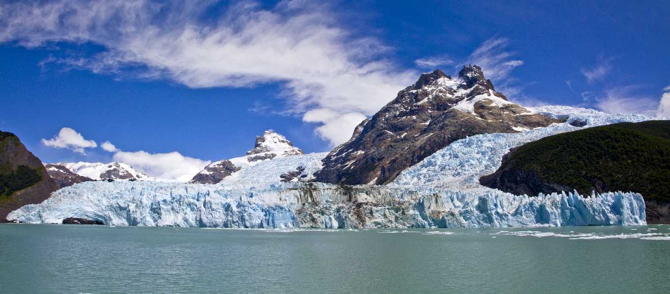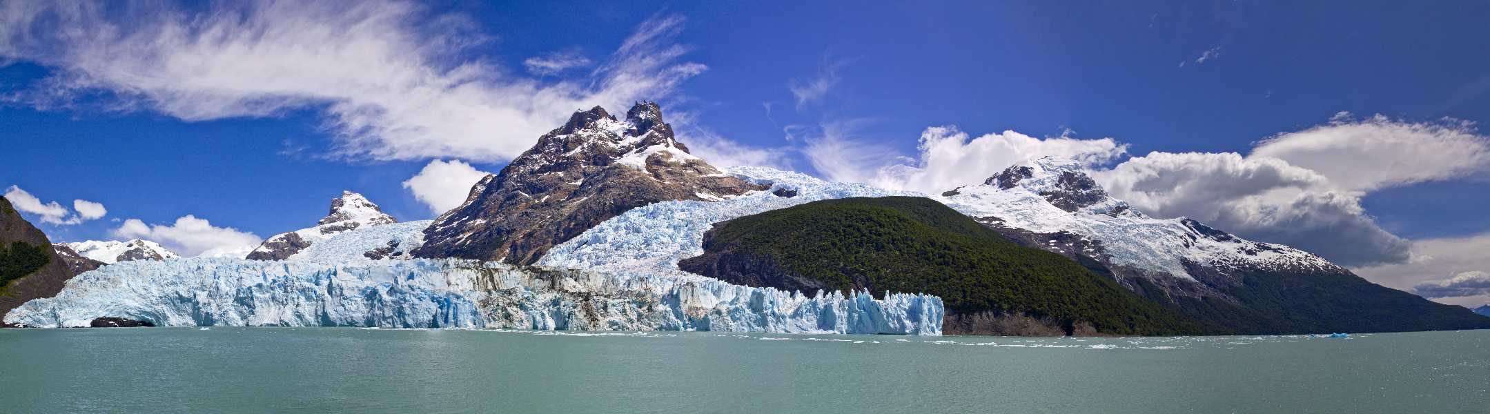 The Spegazzini is relatively small, being about 17 km long, 1.3 km wide at the terminus on the lake and an area of 170 km2. It sits on the lake bottom (150 m deep) and is over 50m high, which gives some idea of its size. It faces north - east, in contrast to the Upsala glacier that faces south. It rises more rapidly than the Upsala and the Perito Moreno glaciers, and several smaller glaciers join it.