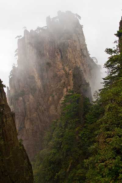 It consists on many named peaks around a central but not flat plateau, and is well known for its fantastic scenery, sunsets, peculiarly-shaped granite peaks, Huangshan Pine trees, hot springs, winter snow, and views of the clouds from above. Trees grow up to the treeline at 1,800 meters, becoming more and more peculiar at higher altitudes. Their shapes are one of the inspirations for Bonsai tree shapes, with one or two long branches reaching out from the mountain sides in one direction only.